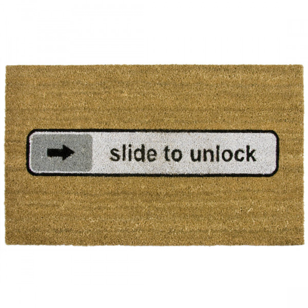 Fußmatte mit dem Aufdruck "slide to unlock" (Schieben zum Entriegeln). Hochwertig verarbeitet aus reinen Kokosfasern und PVC.